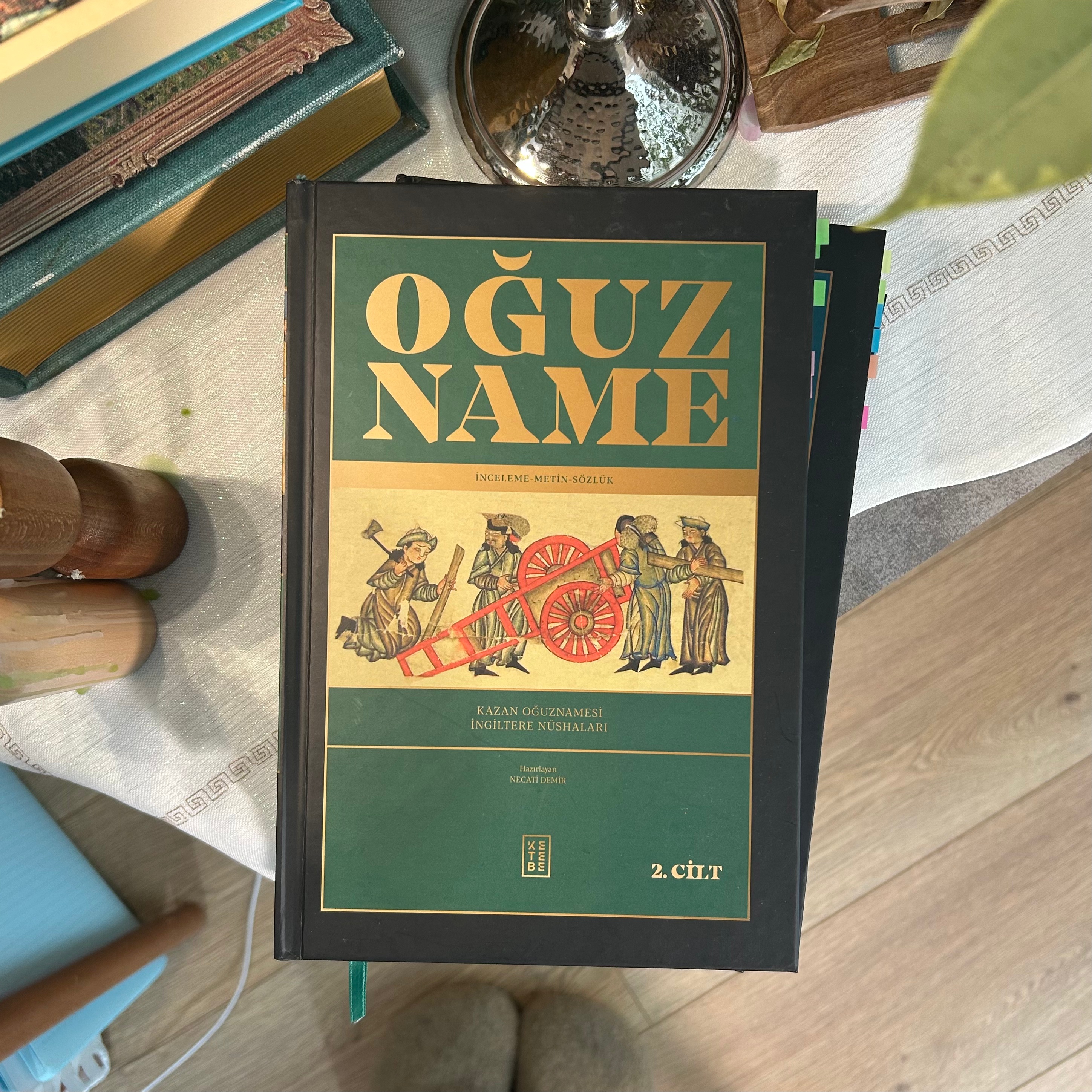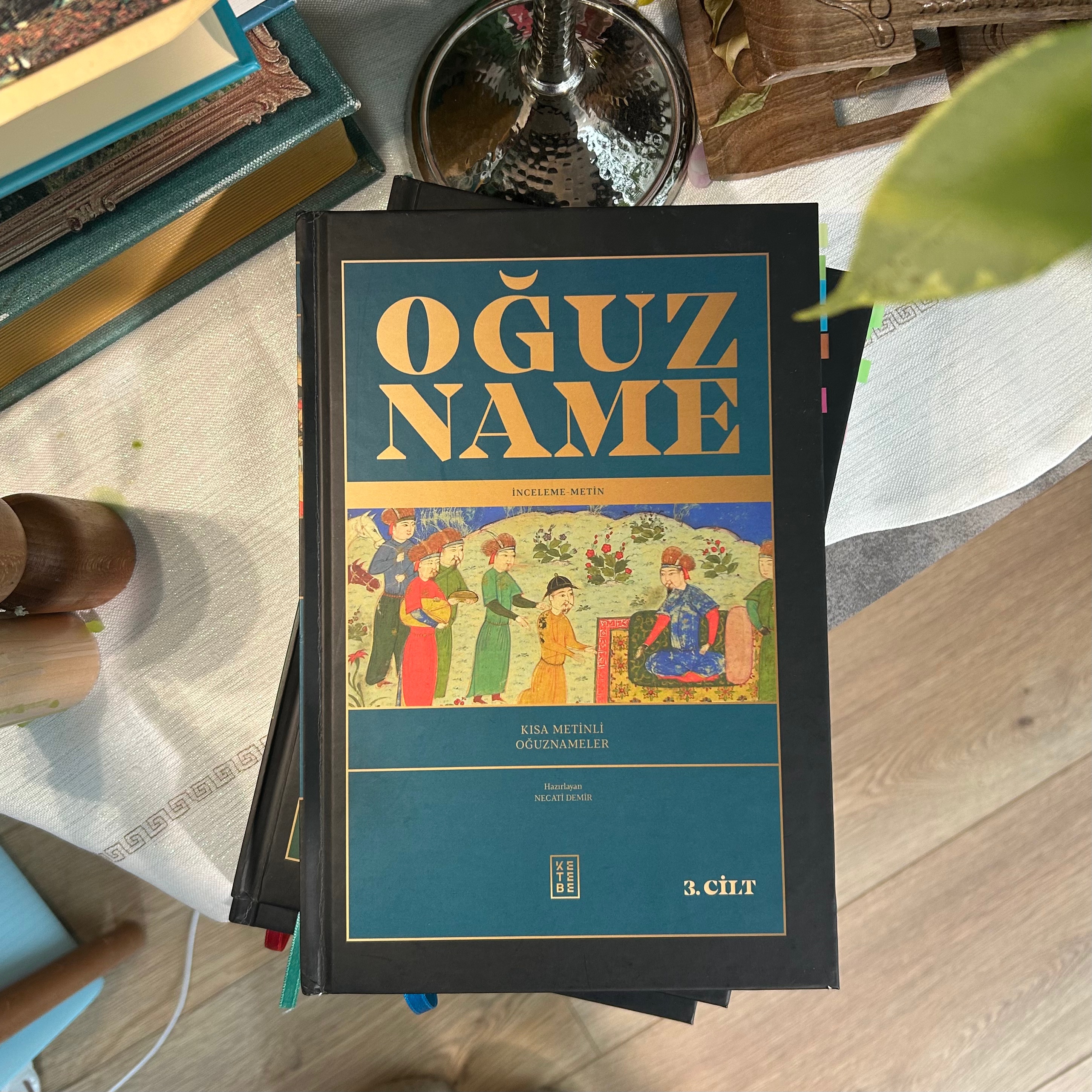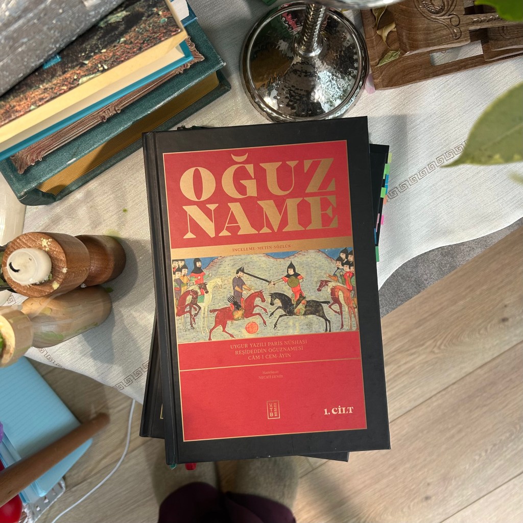 Çok heyecanlıyım, Oğuzname’yi ilk gördüğümde de kalbim hızlanmıştı. İşte okulda Hesiod’u, İlyada’yı, Beowolf’u okurken hissettiğim o burukluk artık bana çok yakındı. Birkaç ay sonra nasip oldu kitabı almak. 3 cilt, içerisinde dünyanın farklı yerlerinden 18 nüsha bulunuyor. Okumaya başlamadan önce Oğuzname bir süre salondaki kitap yığınında beni bekledi. Final dönemi, tatildeki iş yoğunluğu derken başlamam biraz sürdü. Ama okumaya başladığım günden sonra bir akşam bile elime almadan geçmediğimi de belirtmek isterim.